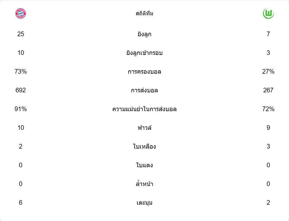 - ครองบอล: บาเยิร์น 73% – 27% โวล์ฟสบวร์ก