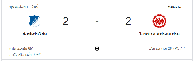 นาทีที่ 98: กรรมการเป่านกหวีดจบเกม ฮอฟเฟ่นไฮม์เสมอกับแฟรงก์เฟิร์ต 2-2 ในเกมที่เต็มไปด้วยจังหวะสำคัญและการลุ้นระทึกจนวินาทีสุดท้าย