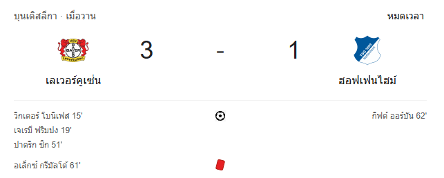 แม้เลเวอร์คูเซินจะต้องเล่น 10 คนช่วงท้ายเกม แต่พวกเขายังคงครองเกมและเก็บชัยชนะได้แบบไร้ปัญหา ขณะที่ฮอฟเฟนไฮม์แม้จะไล่คืนมาได้หนึ่งลูก แต่ไม่สามารถคัมแบ็กกลับมาได้