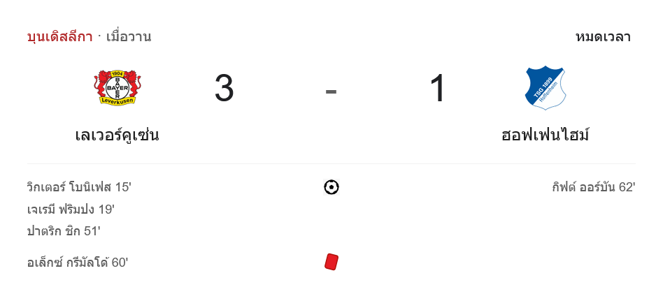 ศึก บุนเดสลีกา 2024 เมื่อคืนที่ผ่านมา เป็นเกมที่เต็มไปด้วยความเข้มข้นและดุดัน โดย ไบเออร์ เลเวอร์คูเซิน เปิดบ้านเอาชนะ ทีเอสจี ฮอฟเฟนไฮม์ ไปได้อย่างสุดมัน 3-1 สร้างความสุขให้แฟนบอลเจ้าถิ่นเต็มสนาม แม้ว่าจะเหลือผู้เล่นแค่ 10 คนในครึ่งหลังหลังจากที่ อเล็กซ์ กริมัลโด้ โดนใบแดง แต่ทีมยังคงโชว์ศักยภาพการเล่นที่เหนือชั้นเก็บ 3 แต้มสำคัญได้สำเร็จ นี่คือบทสรุปหลังเกมแบบละเอียดโดย บ้านกีฬา ที่ไม่ควรพลาด!