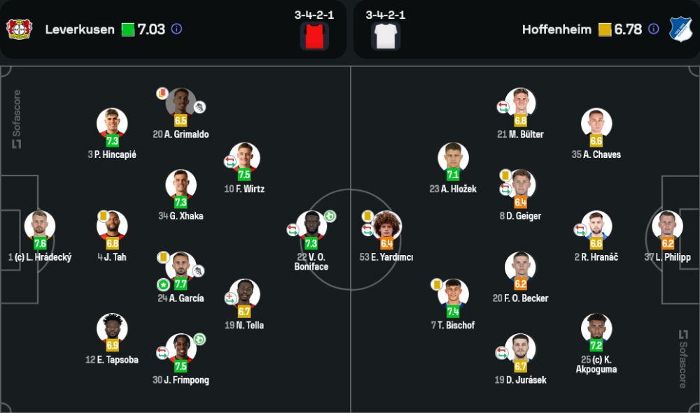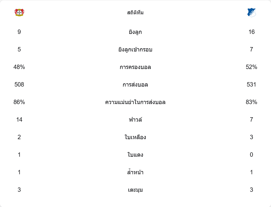 แม้ฮอฟเฟนไฮม์จะครองบอลได้มากกว่า (52%) แต่เลเวอร์คูเซินกลับใช้โอกาสได้อย่างมีประสิทธิภาพ ยิงเข้ากรอบ 5 จาก 9 ครั้ง ขณะที่ฮอฟเฟนไฮม์ยิงถึง 16 ครั้งแต่เข้ากรอบแค่ 7 ครั้ง ความแม่นยำในการผ่านบอลของเลเวอร์คูเซินสูงถึง 86% แสดงให้เห็นถึงการคุมเกมได้อย่างมั่นคง