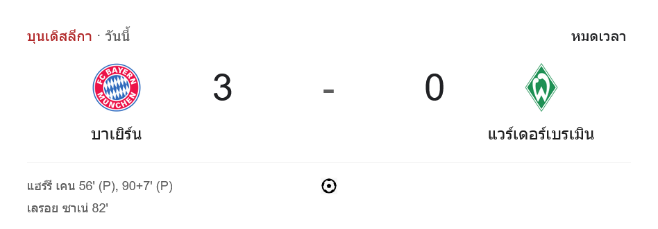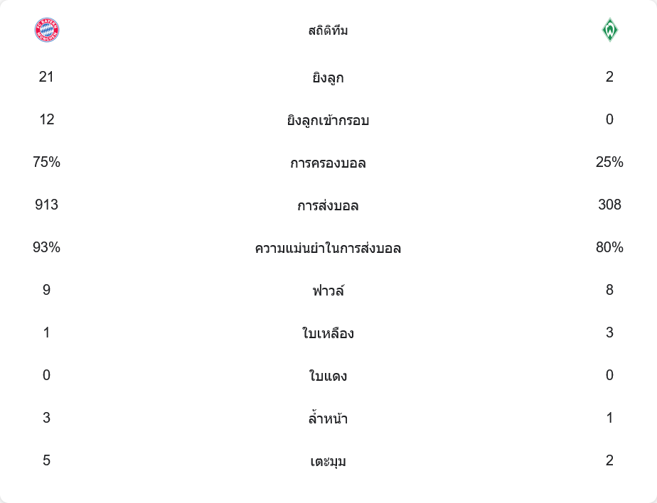 - เตะมุม: บาเยิร์น 5 ครั้ง | เบรเมน 2 ครั้ง