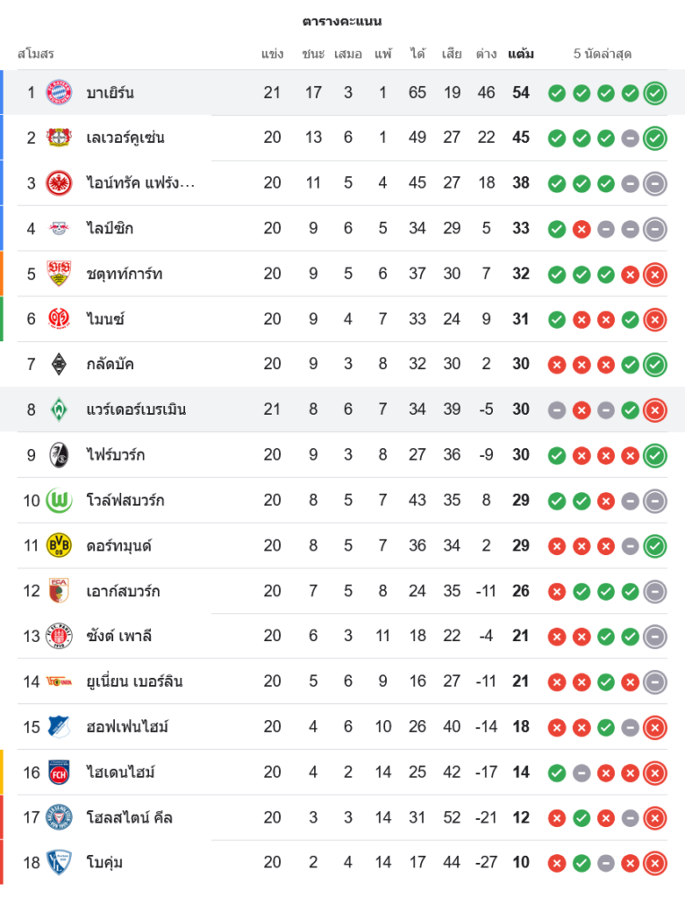 ชัยชนะในเกมนี้ทำให้ บาเยิร์น มิวนิค เก็บเพิ่มเป็น 54 คะแนน จาก 21 นัด ยังคงรั้งจ่าฝูงและทำแต้มทิ้งห่าง เลเวอร์คูเซ่น ที่มี 45 คะแนน ส่วน แวร์เดอร์ เบรเมน ยังคงอยู่ที่อันดับ 8 มี 30 คะแนน