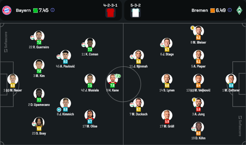 ด้าน แวร์เดอร์ เบรเมน วางแผนมาเล่นรับลึกแต่สุดท้ายก็ไม่อาจต้านทานแนวรุกของบาเยิร์นได้ จุดที่พวกเขาเสียเปรียบชัดเจนคือการครองบอลที่มีแค่ 25% และการต่อบอลที่แม่นยำน้อยกว่าทีมเจ้าบ้าน