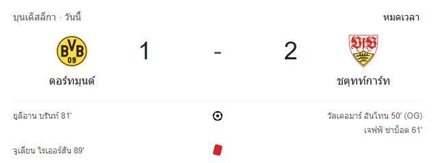 แม้ว่าดอร์ทมุนด์จะพยายามเปิดเกมรุกอย่างหนัก แต่กลายเป็นฝั่งสตุ๊ตการ์ตที่ใช้โอกาสไม่เปลือง พร้อมฉกฉวยความผิดพลาดของเจ้าถิ่นไปลงโทษได้สำเร็จ ทำให้จบเกม ดอร์ทมุนด์ พ่าย สตุ๊ตการ์ต 1-2 คาบ้านตัวเองแบบสุดช็อก