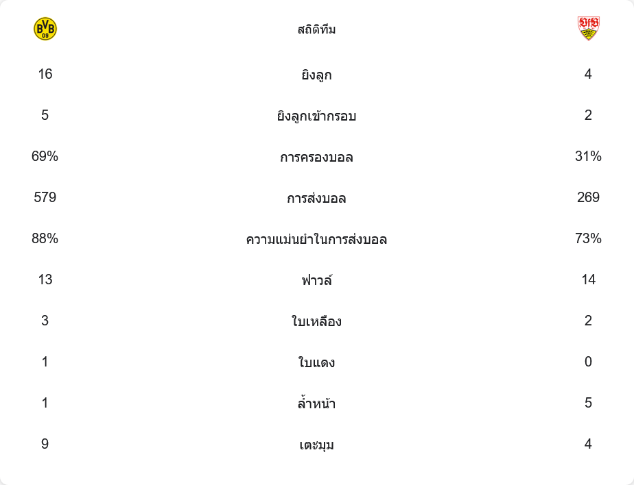แม้ว่าดอร์ทมุนด์จะยิงถึง 16 ครั้ง แต่ตรงกรอบเพียง 5 ครั้ง เท่านั้น ขณะที่สตุ๊ตการ์ตแม้จะยิงแค่ 4 ครั้ง แต่เข้าเป้า 2 ครั้งและเป็น 2 ประตู เกมนี้เจ้าถิ่นเสียเปรียบเรื่องการฟาวล์ (13 ต่อ 14) และได้รับใบเหลืองมากกว่า (3 ต่อ 2) ส่วนลูกเตะมุม ดอร์ทมุนด์ได้มากถึง 9 ครั้ง แต่ใช้โอกาสไม่คุ้มค่า