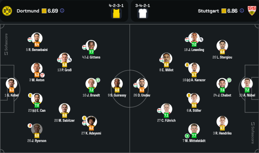 ดอร์ทมุนด์มาในระบบ 4-2-3-1 มี จูเลียน บรันด์ท เป็นตัวปั้นเกม ขณะที่ สตุ๊ตการ์ต ใช้แผน 3-4-2-1 ตั้งรับเหนียวแน่นแล้วใช้เกมสวนกลับ เจ้าถิ่นครองบอลถึง 69% และมีโอกาสยิงถึง 16 ครั้ง แต่จังหวะจบสกอร์ยังขาดความเฉียบคม โดยเฉพาะ คาริม อเดเยมี่ และ เซบาสเตียน ฮัลแลร์ ที่พลาดโอกาสทองหลายครั้ง