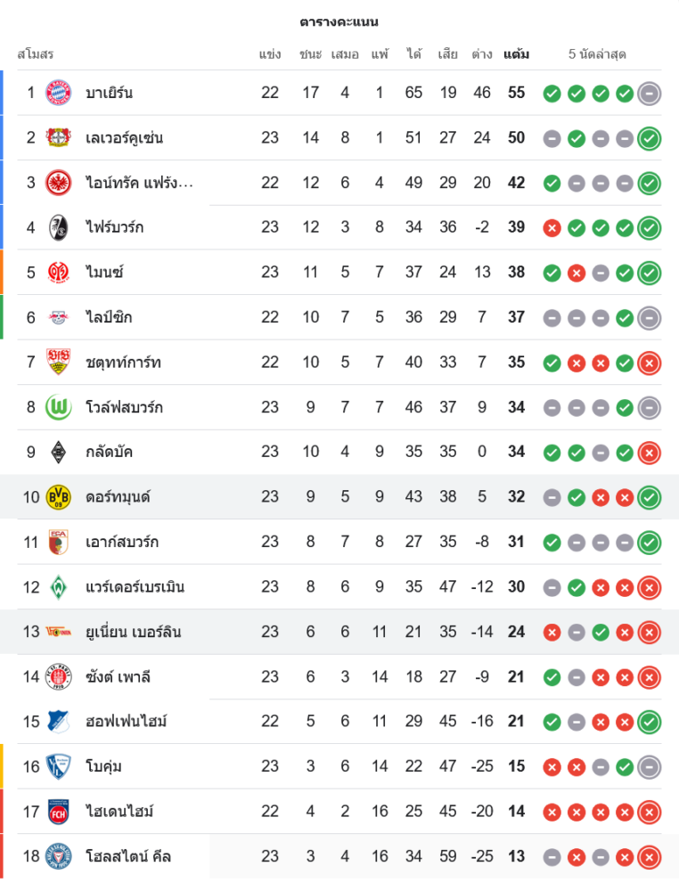 ดอร์ทมุนด์ เก็บเพิ่มเป็น 32 แต้ม ขยับขึ้นอันดับ 10 ตามหลังพื้นที่ยุโรปเพียง 3 แต้ม ขณะที่ ยูเนี่ยน เบอร์ลิน จมอยู่อันดับ 13 มีเพียง 24 คะแนน ห่างโซนตกชั้นเพียง 3 แต้ม