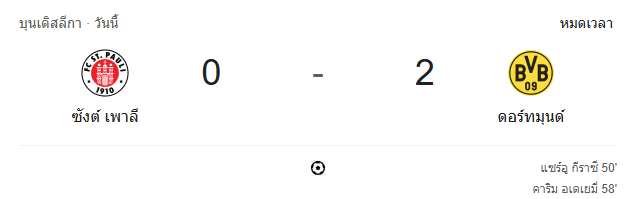 หมดเวลาการแข่งขัน ซังค์ เพาลี 0-2 โบรุสเซีย ดอร์ทมุนด์ เสือเหลืองคว้าชัยแบบเหนือชั้น