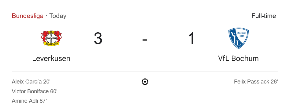จากนั้น เลเวอร์คูเซิน ยังคงบุกอย่างต่อเนื่องเพื่อปิดเกมและพยายามทำประตูเพิ่มเติม จนกระทั่งในนาทีที่ 87 อามีน อัดลี จัดการซัดประตูตอกย้ำชัยชนะให้กับเจ้าบ้าน ขยับสกอร์ไปเป็น 3-1 และจบเกมด้วยผลการแข่งขันนี้