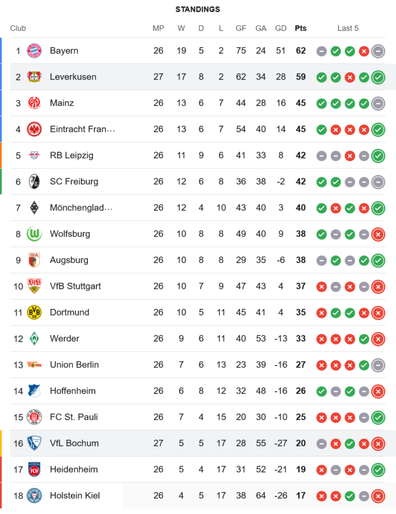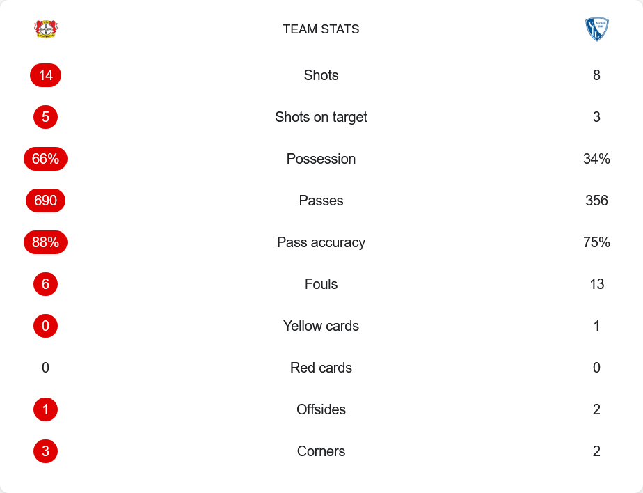 ชัยชนะในนัดนี้ทำให้ เลเวอร์คูเซิน ขยับคะแนนขึ้นมาเป็น 59 คะแนน จาก 27 นัด รั้งอันดับที่ 2 ของตาราง ตามหลัง บาเยิร์น มิวนิค ที่มี 62 คะแนน อยู่เพียง 3 คะแนนเท่านั้น ขณะที่ โบคุ่ม ยังคงต้องดิ้นรนอย่างหนักเพื่อหนีโซนตกชั้น โดยพวกเขาอยู่ในอันดับที่ 16 มีเพียง 20 คะแนน จาก 27 นัด