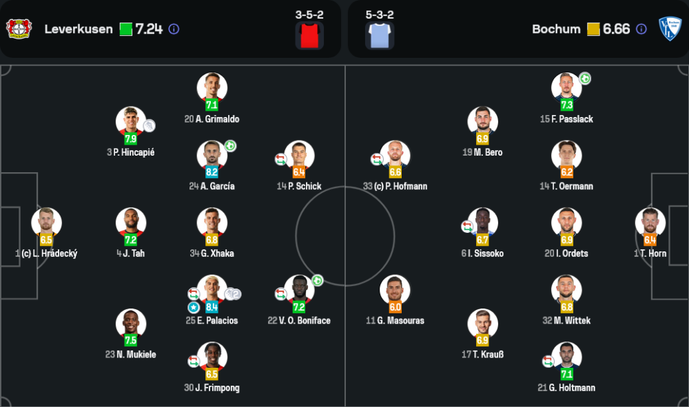 เอเซเกล ปาลาซิออส คือนักเตะที่โชว์ฟอร์มยอดเยี่ยมในนัดนี้ ด้วยคะแนนสูงสุด 8.4 เขาทำหน้าที่เป็นหัวใจหลักในแดนกลางของ เลเวอร์คูเซิน คอยสร้างสรรค์เกมรุกและช่วยทีมในการป้องกันได้อย่างยอดเยี่ยม