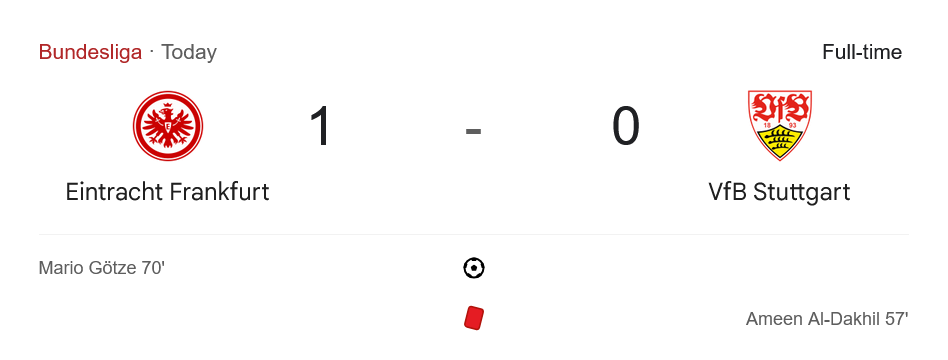 และในที่สุด ในนาทีที่ 70 มาริโอ โกเซ่ สามารถยิงประตูให้กับเจ้าถิ่นขึ้นนำได้สำเร็จ เป็นการจบสกอร์ที่เฉียบคมหลังจากได้รับโอกาสที่ดี นำพาให้ ไอน์ทรัค แฟร้งค์เฟิร์ต ขึ้นนำ 1-0