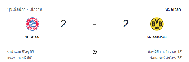 ทั้ง บาเยิร์น และ ดอร์ทมุนด์ ต่างงัดฟอร์มระดับสุดยอดออกมาใส่กันไม่ยั้ง แต่ผลเสมอ 2-2 ทำให้ทั้งสองทีมต้องแบ่งแต้มแบบที่ทั้งคู่ยังมีเรื่องให้กลับไปแก้ต่อ เกมนี้แสดงให้เห็นชัดเจนว่าใน ผลบอลสด ระดับ “แดร์คลาสสิเคอร์” ทุกจังหวะคือความเป็นความตาย และทุกวินาทีมีค่าอย่างมหาศาล