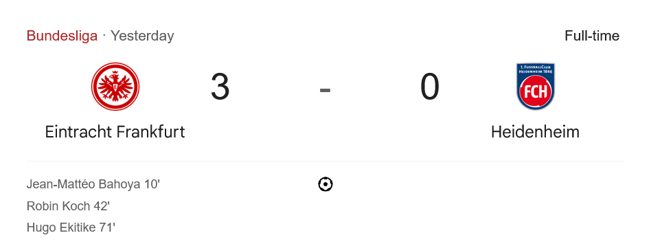 ครึ่งหลังแม้ไฮน์เดนเฮลม์จะครองบอลได้มากกว่า แต่แนวรุกยังขาดไอเดียในการเจาะแผงรับของเจ้าบ้าน จนกระทั่งนาทีที่ 71 แฟร้งค์เฟิร์ตสวนกลับเร็ว และเป็น นาธาเนียล บราวน์ ที่พาบอลเข้าเขตโทษก่อนถวายพานให้ ฮูโก้ เอคิติเก้ ซัดเรียดเสียบเสาเข้าไปอย่างเฉียบคม กลายเป็นประตูปิดกล่องพาทีมเปิดบ้านเก็บสามแต้มสุดแกร่งในค่ำคืนนี้