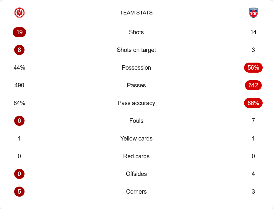แม้แฟร้งค์เฟิร์ตจะครองบอลน้อยกว่าที่ 44% และผ่านบอล 490 ครั้งเทียบกับไฮน์เดนเฮลม์ที่ครองบอล 56% ผ่านบอล 612 ครั้ง แต่เจ้าบ้านกลับทำได้ดีกว่าชัดเจนในการเข้าทำ โดยมีโอกาสยิง 19 ครั้ง เข้ากรอบ 8 ครั้ง และได้ถึง 3 ประตู ขณะที่ไฮน์เดนเฮลม์ยิง 14 ครั้ง แต่เข้ากรอบเพียง 3 ครั้งเท่านั้น ด้านความแม่นยำในการจ่ายบอลอยู่ในระดับสูงทั้งสองทีม (84% และ 86%) เกมนี้ไม่มีใบแดง มีเพียงฝั่งละหนึ่งใบเหลือง การฟาวล์และลูกตั้งเตะค่อนข้างสมดุลตลอดทั้งเกม