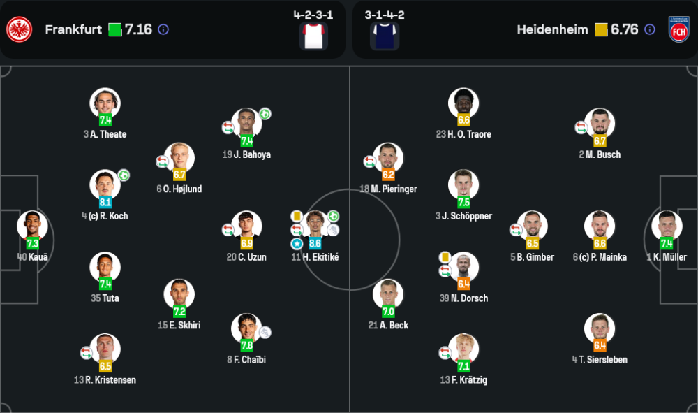 แฟร้งค์เฟิร์ตจัดทัพในระบบ 4-2-3-1 ที่เล่นได้อย่างสมดุลทั้งเกมรับและรุก ด้วยการให้ไชอิบีขับเคลื่อนเกมริมเส้นซ้าย ขณะที่บาโฮยาเล่นงานฝั่งขวา สคิรีคุมจังหวะกลางสนามอย่างนิ่ง มีค็อคและตูต้าคุมเกมรับเหนียวแน่นและจัดการลูกกลางอากาศได้อยู่หมัด ส่วนการจบสกอร์ของเอคิติเก้และบาโฮยาแสดงให้เห็นถึงความเด็ดขาดขั้นสูง