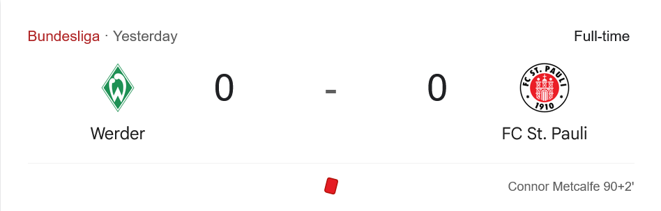 ครึ่งหลังรูปเกมเปิดแลกกันมากขึ้น ซังค์ เพาลีเริ่มขยับเกมรุกหนักขึ้นและมีโอกาสยิงตรงกรอบถึง 4 ครั้ง แต่ติดเซฟเหนียวหนึบของ มิเชล เซ็ตเตอร์เรอร์ ผู้รักษาประตูเบรเมนที่โชว์ฟอร์มเหนียวเซฟช่วยทีมไว้ได้หลายหน จนถึงช่วงท้ายเกม นาทีที่ 90+2 เกิดเหตุการณ์สำคัญเมื่อ คอนเนอร์ เม็ตคาล์ฟ จากทีมเยือนถูกไล่ออกจากสนามหลังเสียฟาวล์หนัก ทำให้ซังค์ เพาลีต้องเล่น 10 คนในช่วงทดเวลาบาดเจ็บ แต่สุดท้าย เบรเมนก็ไม่สามารถเจาะประตูชัยได้ จบเกมเสมอแบบสุดมัน 0-0