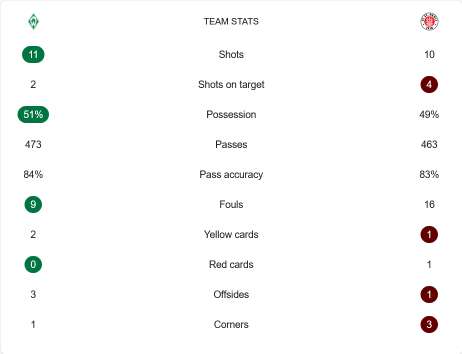 ตลอดเกม เบรเมนครองบอลได้ 51% เทียบกับ 49% ของซังค์ เพาลี ยิงรวม 11 ครั้ง เข้ากรอบ 2 ครั้ง ขณะที่ทีมเยือนยิง 10 ครั้ง เข้ากรอบ 4 ครั้ง จำนวนการส่งบอลใกล้เคียงกัน เบรเมนจ่าย 473 ครั้ง สำเร็จ 84% ซังค์ เพาลีจ่าย 463 ครั้ง สำเร็จ 83% เบรเมนทำฟาวล์ 9 ครั้ง ได้ใบเหลือง 2 ใบ ส่วนซังค์ เพาลีทำฟาวล์ 16 ครั้ง ได้ใบเหลือง 1 ใบและใบแดง 1 ใบ เบรเมนได้เตะมุม 1 ครั้ง ขณะที่ซังค์ เพาลีได้ 3 ครั้ง