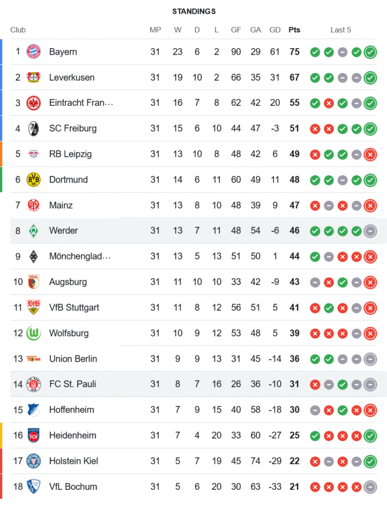 โปรแกรมใน ตารางบอล นัดถัดไป เบรเมนจะต้องยกพลบุกเยือนถิ่นโหดของยูเนี่ยน เบอร์ลิน ในวันที่ 3 พฤษภาคมนี้ เวลา 20:30 น. ขณะที่ซังค์ เพาลีเตรียมเปิดบ้านพบกับสตุ๊ตการ์ตในวันเดียวกัน เป็นแมตช์สำคัญต่อเส้นทางหนีตกชั้นของพวกเขา