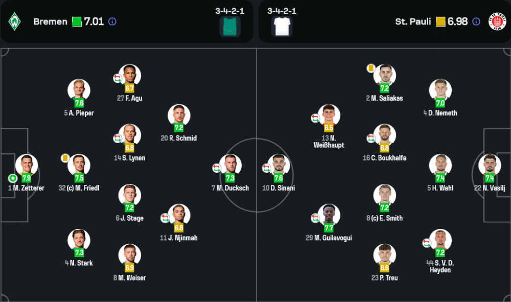 มิเชล เซ็ตเตอร์เรอร์ ผู้รักษาประตูของเบรเมน โชว์ฟอร์มสุดเหนียวด้วยคะแนนสูงถึง 7.9 เซฟจังหวะสำคัญหลายครั้ง โดยเฉพาะการป้องกันลูกยิงของซังค์ เพาลีช่วงครึ่งหลัง จนช่วยทีมเก็บคลีนชีตสำคัญในบ้านได้สำเร็จ