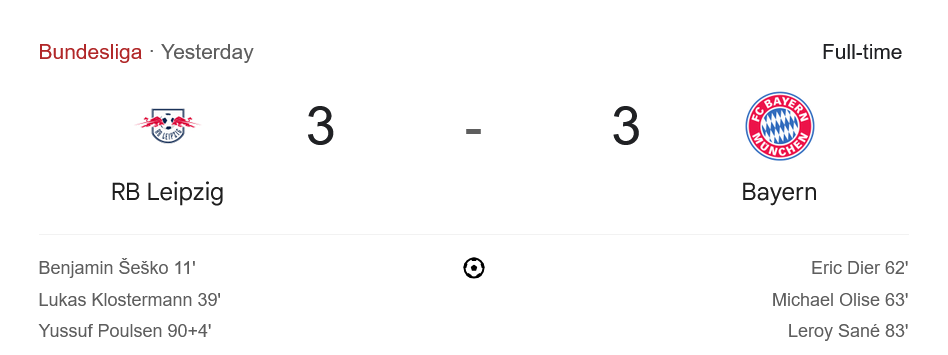 ครึ่งหลัง เกมกลับมาเป็นของบาเยิร์นอย่างชัดเจน เมื่อพวกเขาเปลี่ยนตัวและเร่งจังหวะบุกทันที นาทีที่ 62 เอริก ดายเออร์ โขกลูกเตะมุมเป็นประตูตีไข่แตกให้ทีมเยือนไล่มา 2-1 ก่อนที่เพียงนาทีต่อมา ไมเคิล โอลิสเซ่ จะลากบอลเข้าไปปั่นตุงตาข่ายตีเสมอแบบสายฟ้าแลบ 2-2 สถานการณ์พลิกฝั่งเต็มตัว นาทีที่ 83 เลอรอย ซาเน่ ยิงด้วยซ้ายเข้ามุมแคบให้บาเยิร์นแซงนำ 3-2 ทำท่าว่าจะคว้าชัยอยู่แล้ว แต่สุดท้ายในช่วงทดเวลาเจ็บนาที 90+4 ยูสซูฟ โพลเซ่น กดประตูตีเสมอจากแอสซิสต์ของซิมอนส์ ส่งเสียงเฮสนั่นทั่วทั้งสนาม สรุปแบ่งแต้มสุดมันส์แบบสุดโหด 3-3