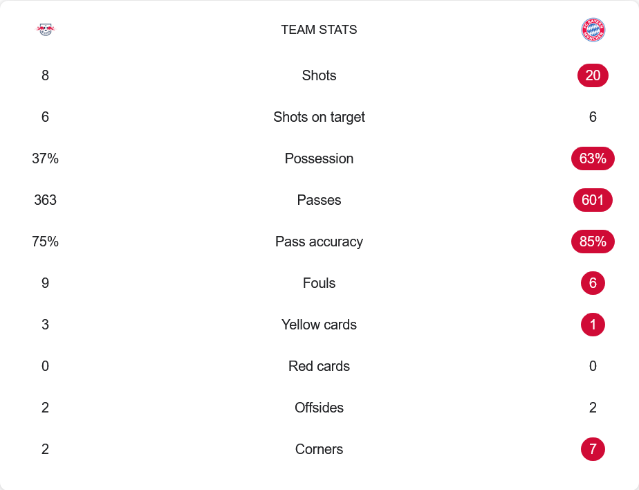 เกมนี้บาเยิร์นครองบอลเหนือกว่าชัดเจนด้วยอัตราครองบอล 63% ต่อ 37% พร้อมสร้างโอกาสยิงได้มากถึง 20 ครั้ง เข้ากรอบ 6 ครั้ง ขณะที่ไลป์ซิกมีโอกาสยิงเพียง 8 ครั้ง แต่เข้ากรอบถึง 6 ครั้ง แสดงถึงความเฉียบคมเมื่อมีโอกาส ในด้านการผ่านบอล บาเยิร์นผ่านบอลถึง 601 ครั้งด้วยความแม่นยำ 85% ส่วนไลป์ซิกผ่านเพียง 363 ครั้ง และความแม่นยำอยู่ที่ 75% โดยรวมแสดงให้เห็นว่าบาเยิร์นครองเกมได้ดีกว่า แต่แนวรับกลับปิดเกมไม่ลง