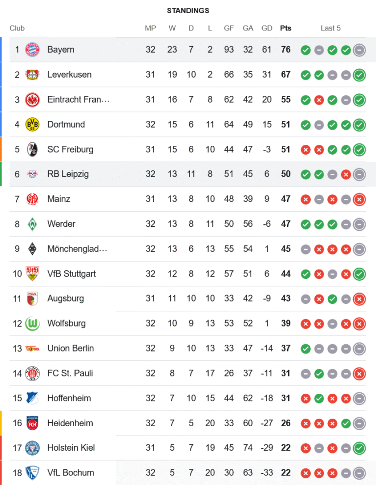 ผลเสมอในนัดนี้ทำให้ บาเยิร์น มิวนิค เก็บเพิ่มเป็น 76 คะแนนจาก 32 นัด ยังคงรั้งจ่าฝูง แต่โดน เลเวอร์คูเซ่น ที่ตามมาเป็นอันดับ 2 ไล่จี้ห่างเพียง 9 แต้มโดยแข่งน้อยกว่าหนึ่งนัด ด้าน แอร์เบ ไลป์ซิก ขยับเพิ่มเป็น 50 แต้มจาก 32 นัด ยังคงอยู่ที่อันดับ 6 แต่ต้องเร่งเครื่องหากหวังโควตายุโรป เพราะเบียดกับไฟรบวร์กและไมนซ์อย่างดุเดือด