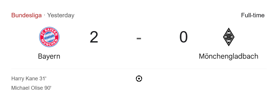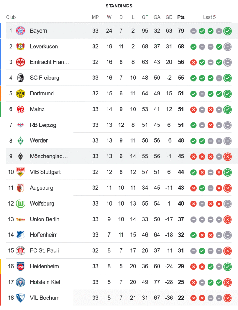 ชัยชนะในนัดนี้ส่งให้ บาเยิร์น มิวนิค เก็บเพิ่มเป็น 79 แต้มจาก 33 นัด รั้งจ่าฝูงของตารางบุนเดสลีกาอย่างมั่นคง โดยมีแต้มทิ้งห่างเลเวอร์คูเซ่นถึง 11 คะแนน (แม้แข่งมากกว่า 1 นัด) ขณะที่กลัดบัคยังอยู่ที่อันดับ 9 มี 45 คะแนน โอกาสลุ้นพื้นที่ยุโรปเริ่มเลือนรางขึ้นเรื่อย ๆ หลังไม่ชนะใครเลยใน 4 นัดหลังสุด