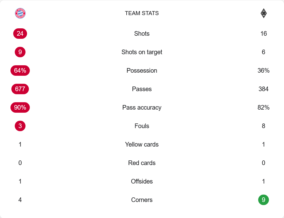 แม้กลัดบัคจะมีโอกาสยิงถึง 16 ครั้ง แต่บาเยิร์นยังครองบอลเหนือกว่าด้วยเปอร์เซ็นต์การครองบอล 64% พร้อมจ่ายบอลแม่นยำถึง 90% จากจำนวนการจ่าย 677 ครั้ง ขณะที่กลัดบัคจ่ายได้เพียง 384 ครั้ง และครองบอลแค่ 36% เสือใต้ยังมีโอกาสยิงมากถึง 24 ครั้ง เข้ากรอบ 9 ส่วนกลัดบัคเข้ากรอบ 6 ครั้ง การเข้าทำของบาเยิร์นแม่นยำและมีประสิทธิภาพมากกว่า แม้กลัดบัคจะได้เตะมุมมากกว่าถึง 9 ครั้งต่อ 4 ก็ตาม