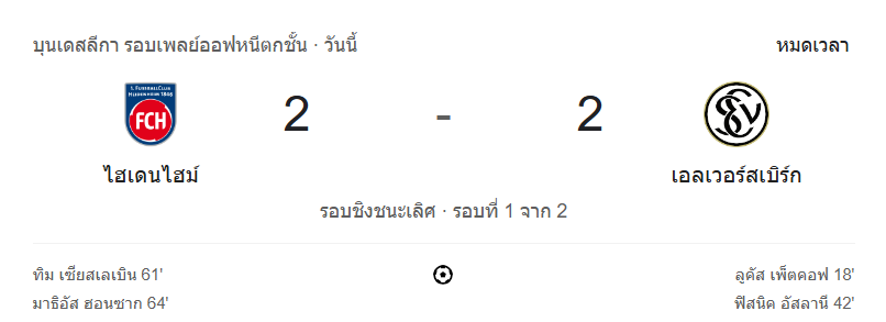 - ช่วงทดเจ็บ 90+3: หมดเวลาการแข่งขัน ไฮเดนไฮม์เปิดบ้านไล่เจ๊าเอลเวอร์สแบร์กสุดมัน 2-2