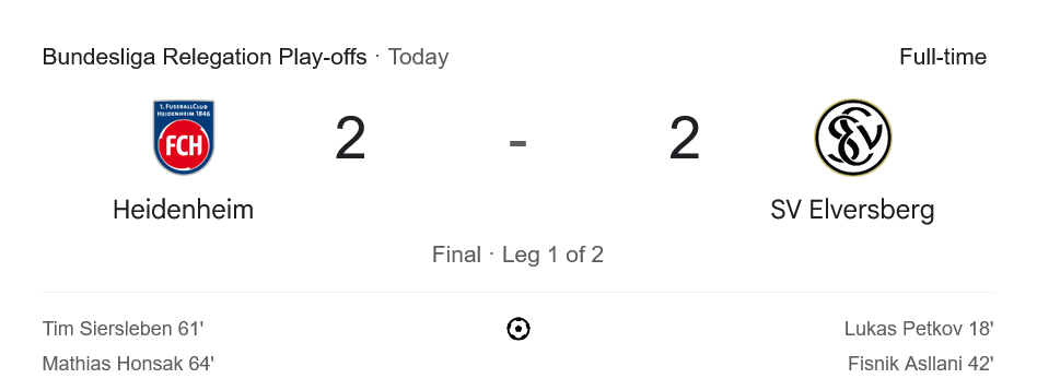เกมนี้เป็นนัดเพลย์ออฟเลกแรกในการชี้ชะตาทีมสุดท้ายของ บุนเดสลีก้า 2025 โดยไฮน์เดนไฮม์พยายามรักษาสิทธิ์อยู่รอด ส่วนเอลเวอร์สเบิร์กหวังเลื่อนชั้นขึ้นมาในฤดูกาลหน้า การเสมอกัน 2-2 พร้อมอเวย์โกล 2 ลูก ทำให้เอลเวอร์สเบิร์กได้เปรียบเล็กน้อยก่อนกลับไปเล่นในบ้านของตัวเองในเลกสอง