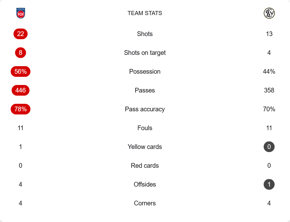แม้จะเป็นฝ่ายเปิดเกมรุกและครองบอลมากกว่า แต่ไฮน์เดนไฮม์กลับใช้โอกาสได้ไม่เต็มที่ โดยมีโอกาสยิงรวมถึง 22 ครั้ง เข้ากรอบ 8 ครั้ง เทียบกับเอลเวอร์สเบิร์กที่ยิงเพียง 13 ครั้ง เข้ากรอบแค่ 4 แต่ได้ถึง 2 ประตู ด้านการครองบอลเจ้าบ้านเหนือกว่าที่ 56% พร้อมกับการจ่ายบอล 446 ครั้ง ด้วยความแม่นยำ 78% ขณะที่ทีมเยือนทำได้ 358 ครั้ง ความแม่นยำเพียง 70% ทั้งสองทีมฟาวล์เท่ากันที่ 11 ครั้ง ไฮน์เดนไฮม์ได้ใบเหลือง 1 ใบ ส่วนเอลเวอร์สเบิร์กไม่มีใบใด ๆ ทั้งคู่ได้เตะมุมเท่ากันที่ 4 ครั้ง