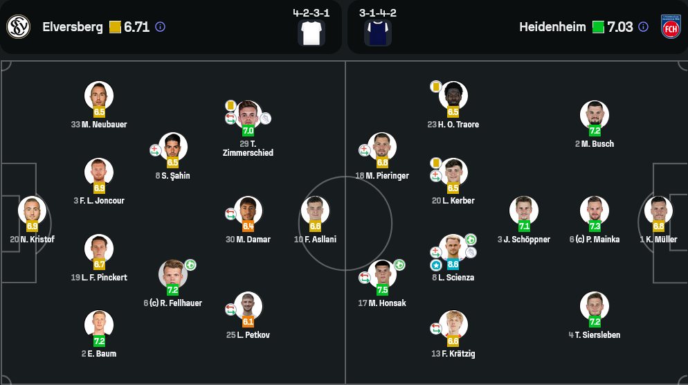 ฝั่งไฮน์เดนเฮลม์ ใช้แผน 3-1-4-2 แบบเน้นโต้กลับรวดเร็ว โดยให้ ชีเอนซ่า ยืนเป็นหัวหมู่ทะลวงฟันที่พร้อมเชื่อมเกมกับมิดฟิลด์ตัวริมเส้นอย่าง ฮอนซัค และ เทรโอเร่ ความเด็ดขาดในการเปลี่ยนจังหวะเป็นประตูคือจุดแข็งที่ช่วยให้พวกเขาเฉือนชนะได้ ทั้งที่มีโอกาสยิงน้อยกว่า แต่มีความแม่นยำมากกว่า ด้วยรูปเกมที่วิเคราะห์บอลออกมาแบบนี้ ไฮน์เดนเฮลม์สมควรได้รับคำชมเรื่องแผนรับแน่นบุกคม