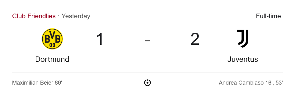 แม้จะเป็นเพียงเกมอุ่นเครื่อง แต่ชัยชนะนัดนี้ช่วยเพิ่มความมั่นใจให้ยูเวนตุสก่อนเข้าสู่ฤดูกาลกัลโช่ เซเรีย อา ขณะที่ดอร์ทมุนด์ต้องกลับไปปรับเกมรุกให้คมกว่านี้ก่อนลงสนามในบุนเดสลีกา