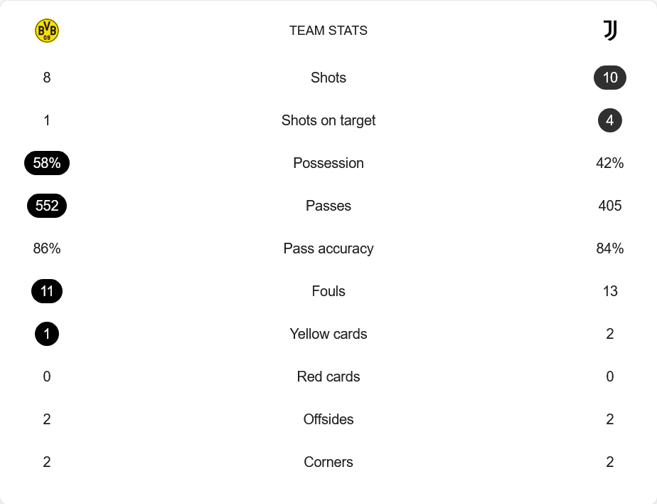 ดอร์ทมุนด์ครองบอลมากกว่า 58% ต่อ 42% และจ่ายบอลแม่นยำ 86% เทียบกับยูเวนตุสที่แม่นยำ 84% แต่จังหวะเข้าทำ ยูเวนตุสยิงเข้ากรอบมากกว่า (4 ต่อ 1) ทั้งที่โอกาสรวมใกล้เคียงกัน (ดอร์ทมุนด์ 8 ครั้ง ยูเวนตุส 10 ครั้ง) การฟาวล์มีมากทั้งสองฝั่ง ดอร์ทมุนด์ทำ 11 ครั้ง ยูเวนตุส 13 ครั้ง