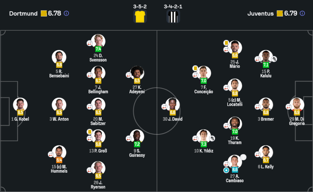 ดอร์ทมุนด์มาในระบบ 3-5-2 เน้นครองบอลจากแดนกลาง โดยมีซาบิตเซอร์คุมเกมและเบลลิงแฮมคอยเชื่อมกับแนวรุก แต่ปัญหาคือจังหวะสุดท้ายไม่คม และการเจาะแผงหลัง 3 ของยูเวนตุสทำได้ยาก ด้านยูเวนตุสของอิกอร์ ทูดอร์ ใช้ระบบ 3-4-1-2 วางยิลดิซปั้นเกมอยู่หลังคู่กองหน้า เล่นเกมรับอย่างมีวินัยและรอโต้กลับเร็ว ซึ่งได้ผลเต็มๆ เมื่อคัมเบียโซมีอิสระเติมเกมขึ้นสูง ทำให้สามารถทำประตูได้ทั้งสองครั้ง การโต้กลับของยูเวนตุสมีความคมและตรงเป้ามากกว่าอย่างชัดเจน