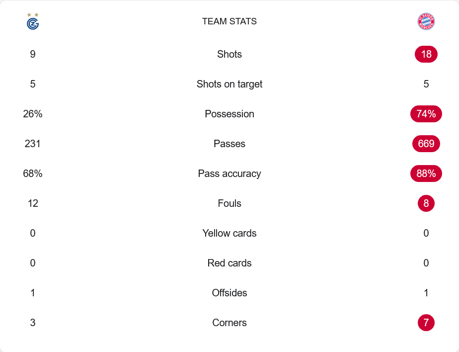 เกมนี้บาเยิร์นครองบอลเหนือกว่าอย่างชัดเจน 74% ต่อ 26% และผ่านบอลถึง 669 ครั้งด้วยความแม่นยำ 88% ส่วนกราสฮ็อปเปอร์จ่ายบอลเพียง 231 ครั้งแม่นยำ 68% ทั้งสองทีมมีโอกาสยิงตรงกรอบเท่ากันที่ 5 ครั้ง แต่บาเยิร์นสร้างโอกาสรวมได้มากถึง 18 ครั้ง ขณะที่เจ้าถิ่นมีเพียง 9 ครั้ง ลูกเตะมุมทีมเยือนมากกว่า 7 ต่อ 3 ฟาวล์ใกล้เคียงกัน