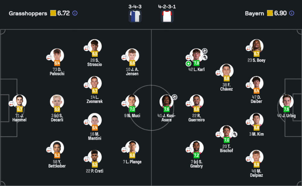 DF: S. Boey (6.7) → 61’ K. Laimer (6.9), D. Daiber (6.4) → 61’ D. Upamecano (6.6), M. Kim (6.8) → 61’ J. Tah (6.7), M. Dalpiaz (6.9) → 61’ J. Stanišić (6.6)