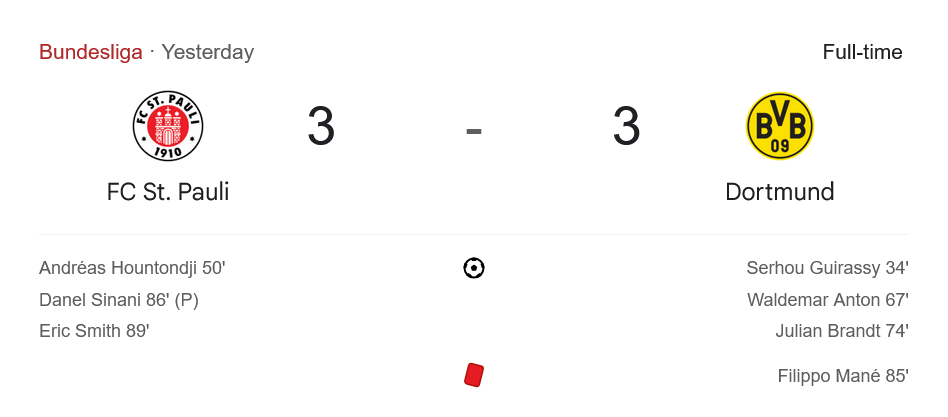 ศึก บุนเดสลีกา เปิดฤดูกาลแบบสุดมันส์ที่มิลเลอร์นทอร์ สตาดิโอน เจ้าถิ่น ซังค์ เพาลี ไล่ตามตีเสมอ โบรุสเซีย ดอร์ทมุนด์ ได้แบบสุดระทึก 3-3 ทั้งที่ตกเป็นฝ่ายตามถึงสองครั้ง เกมนี้เต็มไปด้วยอารมณ์ ความเข้มข้น และจังหวะพลิกผันที่ทำให้แฟนบอลต้องลุ้นกันจนวินาทีสุดท้าย โดย บ้านผลบอล รายงานผลการแข่งขันตาม ผลบอลสด ที่สะท้อนภาพความดุดันของทั้งสองทีม