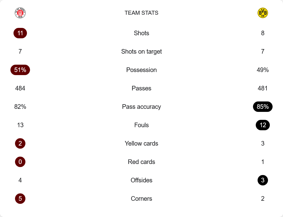 ตัวเลขเกมนี้บอกชัด ซังค์ เพาลีครองบอล 51% จ่ายบอล 484 ครั้ง แม่นยำ 82% ส่วนดอร์ทมุนด์ครอง 49% จ่าย 481 ครั้ง แม่นยำ 85% การยิงตรงกรอบเท่ากันที่ 7 ครั้ง แต่เจ้าถิ่นทำได้ดีกว่าในช่วงท้าย ฟาวล์รวมทั้งสองฝั่งถึง 25 ครั้ง มีใบเหลืองรวม 5 ใบ และใบแดง 1 ใบที่เป็นจุดเปลี่ยนสำคัญของเกม