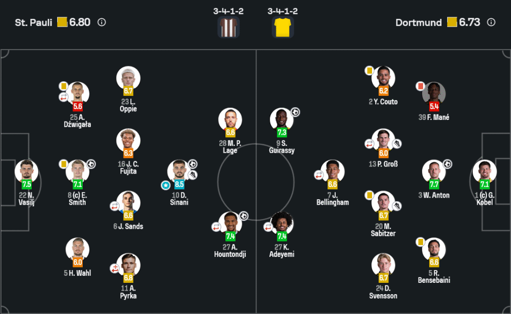 ในแง่ วิเคราะห์บอล เกมนี้ ซังค์ เพาลีใช้ระบบ 3-4-1-2 ที่เน้นความแน่นในแดนกลางและการฉวยโอกาสสวนกลับ จังหวะโต้เร็วทำให้พวกเขาสร้างโอกาสยิงได้ 11 ครั้ง เข้ากรอบถึง 7 และเปลี่ยนเป็น 3 ประตู ขณะที่ดอร์ทมุนด์เองก็มาในระบบเดียวกัน แต่การยืนตำแหน่งเกมรับไม่รัดกุมพอ แม้แนวรุกจะคม ยิงเข้ากรอบ 7 จาก 8 ครั้ง แต่ความผิดพลาดท้ายเกมและการเสียจุดโทษทำให้แต้มหลุดมือ ทั้งที่มีโอกาสปิดเกมไปแล้ว