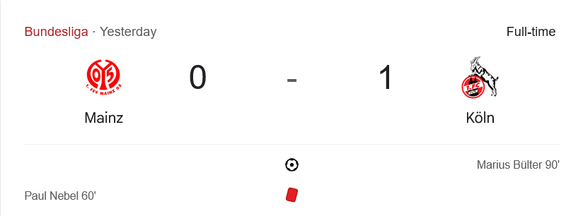 บุนเดสลีกา เยอรมัน เมื่อคืนที่ผ่านมา แฟนๆที่ติดตาม ผลบอลสด ได้เห็นเกมสุดดราม่าที่สนามโคฟาเซ่ อารีนา เมื่อเอฟเอสเฟา ไมนซ์ 05 เปิดบ้านพ่ายต่อโคโลญจน์ 0-1 ทั้งที่ครองเกมได้มากกว่า แต่ต้องมาเจอใบแดงและเสียประตูในช่วงนาทีสุดท้าย ทำเอาแฟนบอลเจ้าถิ่นเจ็บปวดสุดๆ