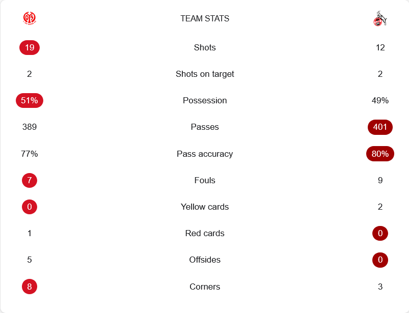 เกมนี้ไมนซ์ครองบอล 51% สร้างโอกาสยิงถึง 19 ครั้ง แต่ตรงกรอบเพียง 2 ขณะที่โคโลญจน์ยิง 12 ครั้ง เข้ากรอบ 2 เท่ากัน การผ่านบอลไมนซ์แม่นยำ 77% ส่วนทีมเยือนเหนือกว่านิดหน่อยที่ 80% ฟาล์วรวม 16 ครั้ง มีใบเหลือง 2 ใบทั้งหมดเป็นของโคโลญจน์ และใบแดง 1 ของเจ้าถิ่น ลูกเตะมุมไมนซ์ได้ถึง 8 ครั้งมากกว่าทีมเยือนที่ได้เพียง 3 ครั้ง แต่ไม่สามารถเปลี่ยนเป็นประตู