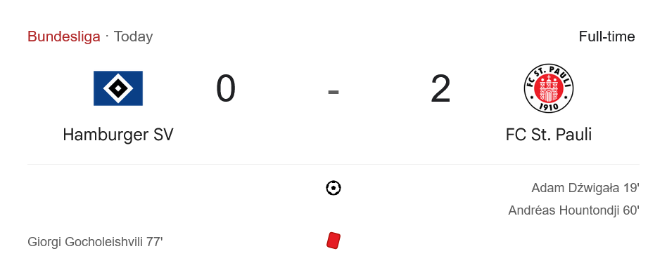 ศึกบุนเดสลีกาคืนเดือดจบลงด้วยผล บ้านผลบอล ที่ทำเอาแฟนบอลฮือฮา เมื่อ ซังค์ เพาลี โชว์ฟอร์มสุดดุดัน บุกอัด ฮัมบูร์ก คาถิ่นโฟล์คสปาร์กสตาดิโอน 2-0 จากประตูของ อดัม ดซ์วิกาลา นาที 19 และ อ็องเดรียส์ ฮูนตอนด์จิ นาที 60 พร้อมขึ้นนำเป็นจ่าฝูงชั่วคราวของตาราง ส่วนเจ้าบ้านฮัมบูร์กเกมรับพังยับ แถมมาเหลือ 10 คนจากใบแดงในครึ่งหลัง