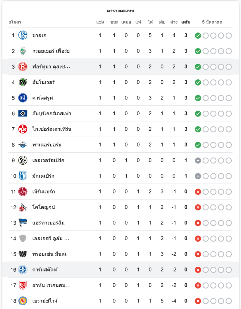 ทีมที่อยู่ในอันดับถัดไปคือชาลเก้ ที่ทำประตูได้มากถึง 5 ประตู และกรอยเธอร์ เฟือร์ธ ที่มีคะแนนเท่ากับฟอร์ทูน่า แต่มีผลต่างประตูได้เสียดีกว่า ขณะที่ทีมที่อยู่ในอันดับล่างสุดของตารางคือเบราน์ชไวก์ ที่ยังไม่มีคะแนนจากการลงเล่น 1 นัด