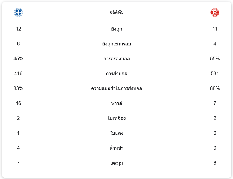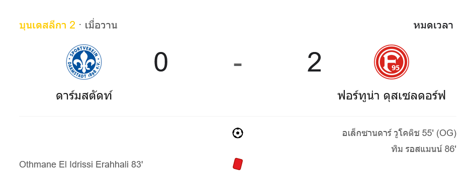 สรุปผลและผลกระทบต่อทีม ด้วยชัยชนะในนัดนี้ ฟอร์ทูน่า ดุสเซลดอร์ฟยังคงรักษาตำแหน่งในกลุ่มหัวตารางของบุนเดสลีก้า 2 เยอรมันได้ โดยมีคะแนนนำทีมอื่น ๆ ขณะที่ดาร์มสตัดท์ต้องพยายามกลับมาแก้ไขฟอร์มการเล่นเพื่อรักษาตำแหน่งในตารางต่อไป การแข่งขันนัดนี้แสดงให้เห็นถึงความสามารถและความมุ่งมั่นของทีมฟอร์ทูน่า ดุสเซลดอร์ฟในการทำประตูและคว้าชัยชนะ
