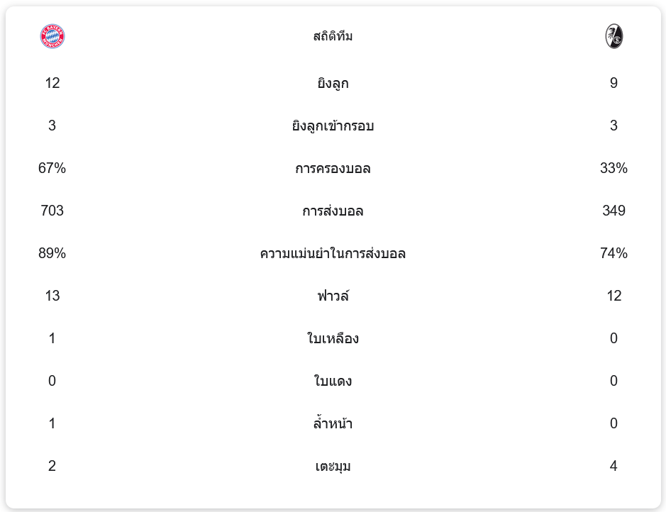 สถิติการแข่งขัน แสดงให้เห็นถึงความเหนือกว่าของบาเยิร์น มิวนิค ที่ครองบอลได้ถึง 67% และมีการส่งบอลทั้งหมด 703 ครั้ง เทียบกับไฟร์บวร์กที่ครองบอลได้เพียง 33% และส่งบอลเพียง 349 ครั้งเท่านั้น บาเยิร์นมีโอกาสยิงทั้งหมด 12 ครั้ง และยิงเข้ากรอบ 3 ครั้ง ขณะที่ไฟร์บวร์กมีโอกาสยิง 9 ครั้ง และยิงเข้ากรอบ 3 ครั้ง ความแม่นยำในการส่งบอลของบาเยิร์นสูงถึง 89% แสดงให้เห็นถึงการควบคุมเกมที่ยอดเยี่ยม