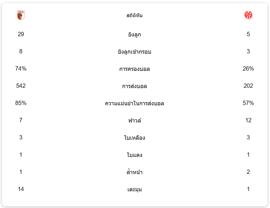 เอาก์สบวร์กเป็นฝ่ายครองเกมได้มากกว่าด้วยการครองบอลถึง 74% และมีการยิงทั้งหมด 29 ครั้ง เข้ากรอบ 8 ครั้ง ขณะที่ไมนซ์ครองบอลเพียง 26% แต่สามารถยิงเข้ากรอบได้ 3 ครั้งจากการยิง 5 ครั้ง เกมนี้แสดงให้เห็นถึงความแตกต่างในประสิทธิภาพในการจบสกอร์ของทั้งสองทีม แม้ว่าเอาก์สบวร์กจะส่งบอลได้แม่นยำถึง 85% จาก 542 ครั้ง แต่ไม่สามารถแปลงเป็นประตูได้อย่างมีประสิทธิภาพ ส่วนไมนซ์มีการส่งบอลเพียง 202 ครั้ง ความแม่นยำ 57% แต่ใช้โอกาสได้ดี