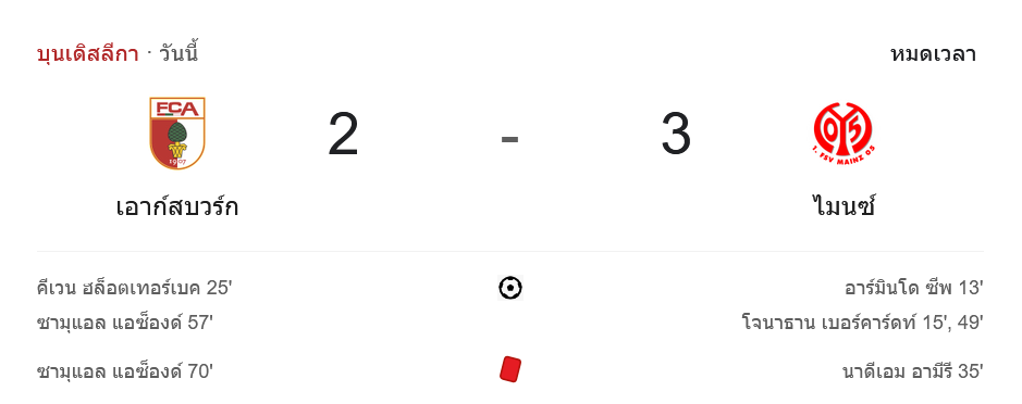การแข่งขันฟุตบอล บุนเดสลีกา 2024 ระหว่าง เอาก์สบวร์ก และ เอฟเอสเฟา ไมนซ์ 05 จบลงด้วยผลสกอร์ 2-3 ในเกมที่เต็มไปด้วยความตื่นเต้นและเหตุการณ์ดราม่ามากมาย เจ้าบ้านเอาก์สบวร์กแม้จะครองบอลได้มากกว่าแต่ไม่สามารถใช้โอกาสทำประตูได้ดีเท่าที่ควร ในขณะที่ไมนซ์ฉวยโอกาสในจังหวะสำคัญได้อย่างเฉียบขาด คว้าชัยชนะกลับไปได้อย่างน่าประทับใจ